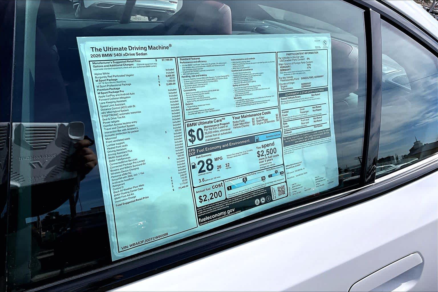 M SPORT PACKAGE Shadowline Exterior Trim, M Steering Wheel, Rear Spoiler, M Sport Package (337), Variable Sport Steering, Wheels: 19 x 8.5 Fr & 19 x 9.0 Rr M Y-Spoke, Style 859M, Bicolor black, Seal & Drive Tire Kit, Tires: 245/40R19 Fr & 255/40R19 Rr Summer, Staggered, Increased Top Speed Limiter, M Fine Brushed Aluminum Interior Trim, Without Lines Designation Outside, M Sport Suspension, Aerodynamic Kit, SHADOWLINE PACKAGE M Sport Package Pro, Full LED Headlights w/Laserlight Taillights, Extended Shadowline Trim, Black Mirror Caps, M Sport Brakes w/Red Calipers, M Shadowline Lights, PREMIUM PACKAGE BMW Curved Display w/HUD, Heated Steering Wheel, harman/kardon Surround Sound System, BLACK W/RED HIGHLIGHT, VERNASCA LEATHER UPHOLSTERY, PARKING ASSISTANCE PACKAGE Drive Recorder, Parking View w/3D View (SurroundView), Active Park Distance Control w/Side Protection, Parking Assistant Plus.