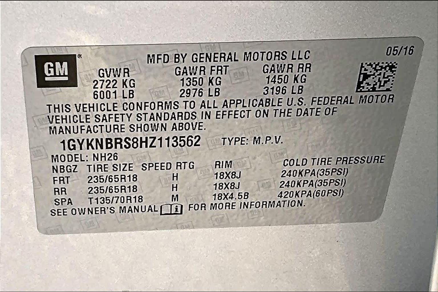 - VIN : 1GYKNBRS8HZ113562