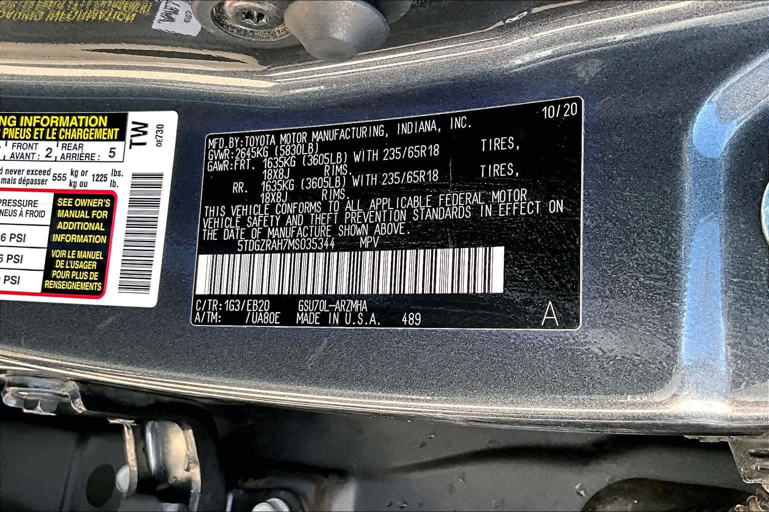 - VIN : 5TDGZRAH7MS035344