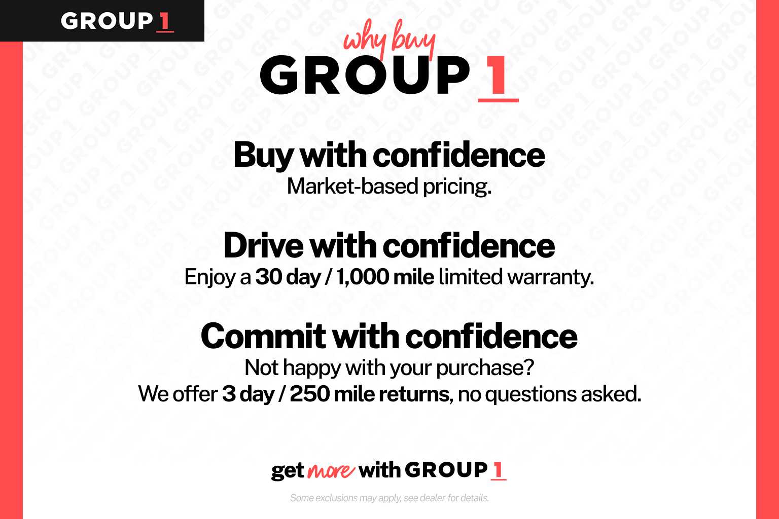Buy with confidence at Group 1 where every used vehicle, up to 175,000 miles, comes with a one month 1,000-mile limited warranty along with a 3-day 250-mile return policy. Some exclusions may apply, see Buyers Guide for specifics. Every vehicle is priced to market and includes a Carfax History Report.
